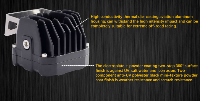 - Housing is upgraded to 304 aluminum. The surface is UV polyester powder coated to prevent against UV, salt water, corrosion, fading and scratch resistant.